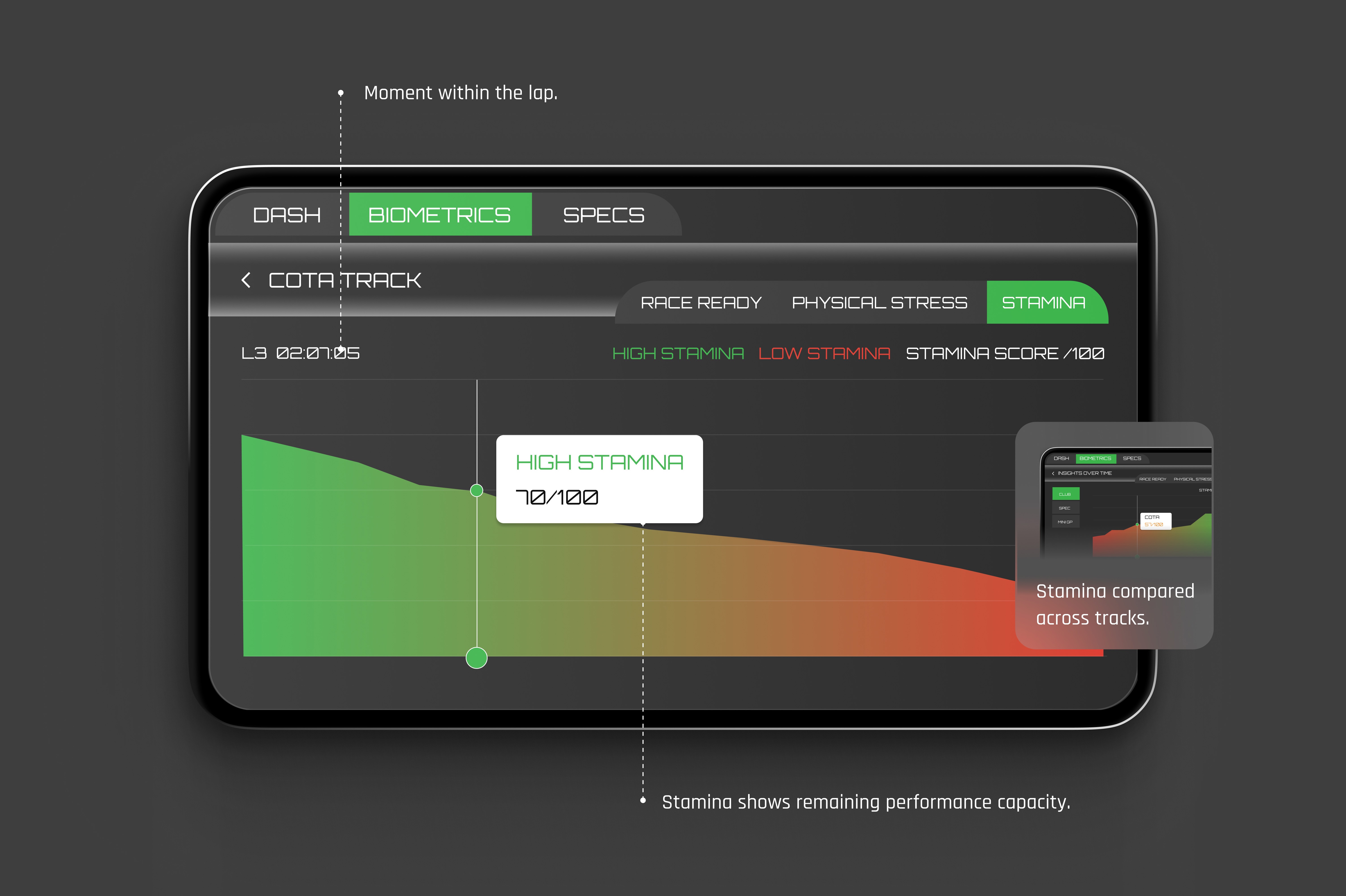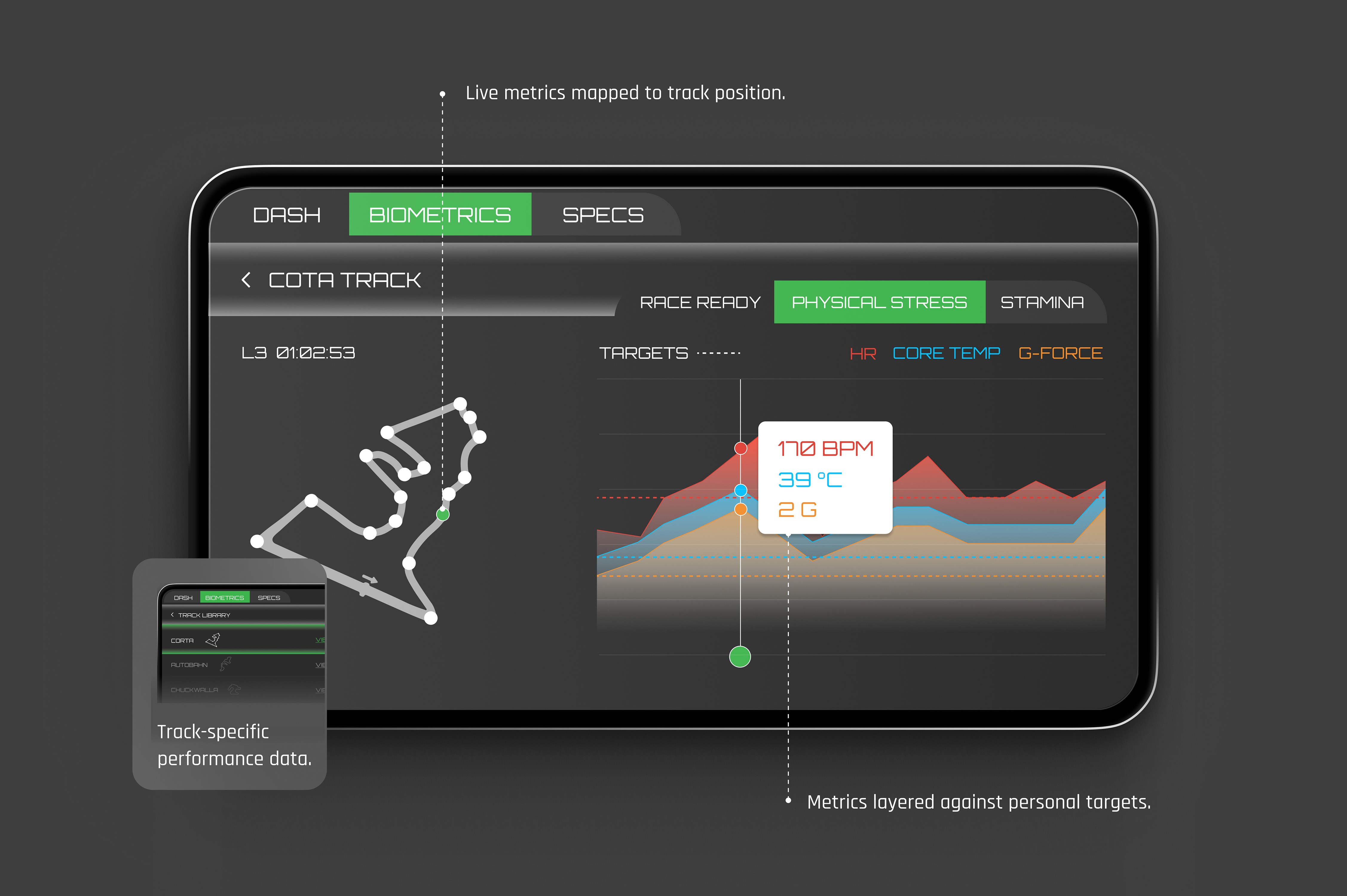 Physical Stress captures how the body responds under race conditions. Live heart rate, core temperature, and G-force load reflect real-time exertion, while lap times and segment splits provide performance context. This layer connects biometric effort directly to on-track output.
