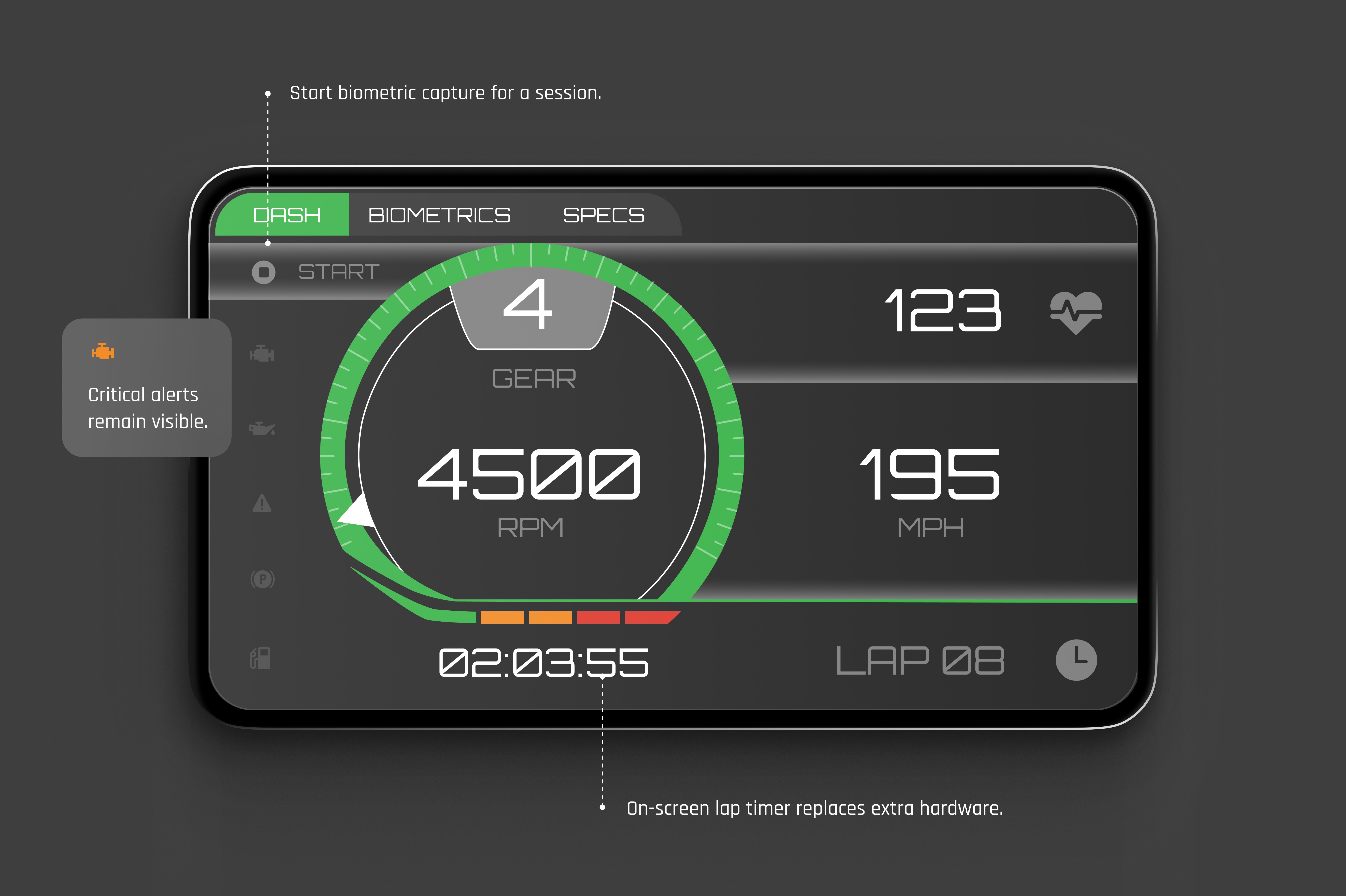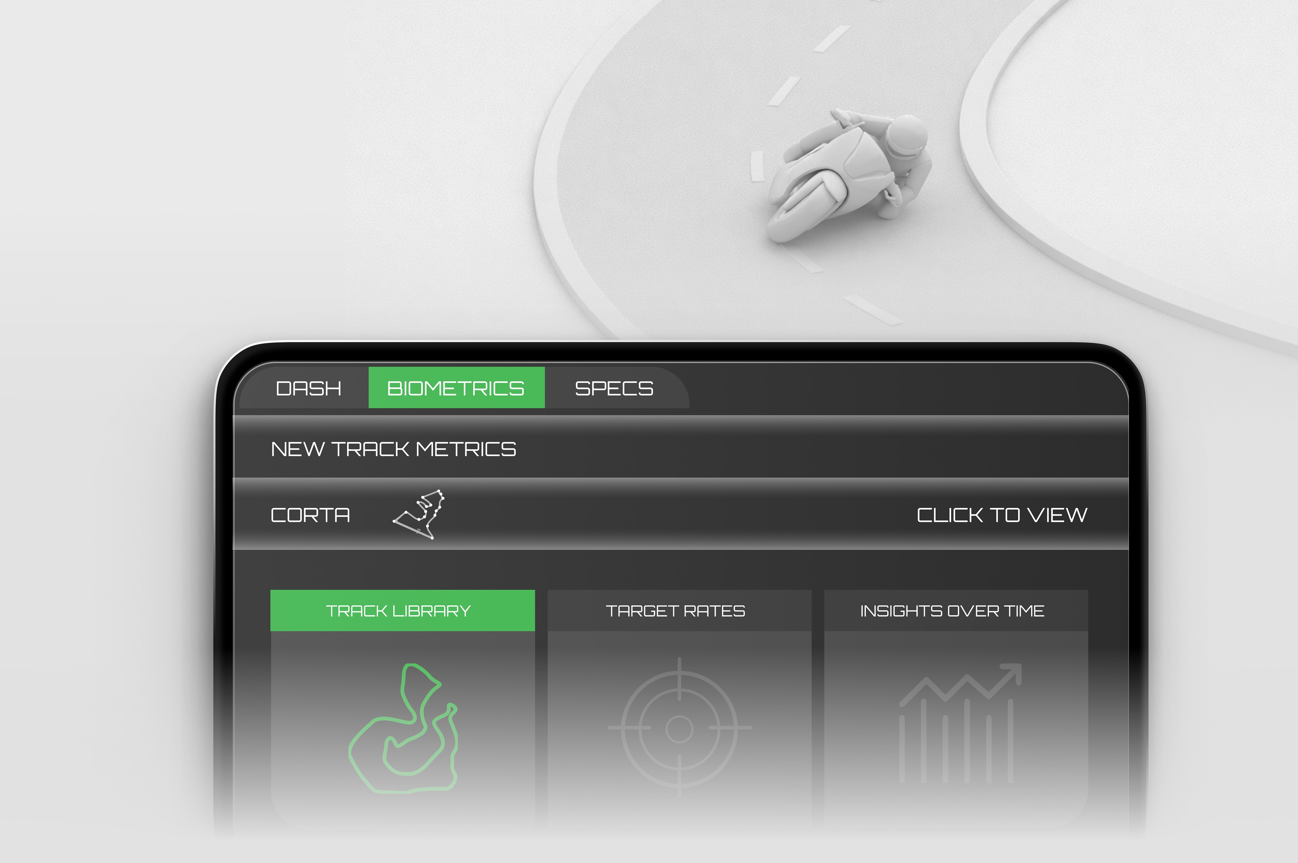 Designed for high-speed conditions, the race interface prioritizes hierarchy and glanceability. Only essential performance signals surface during active sessions, allowing riders to interpret data without distraction.
