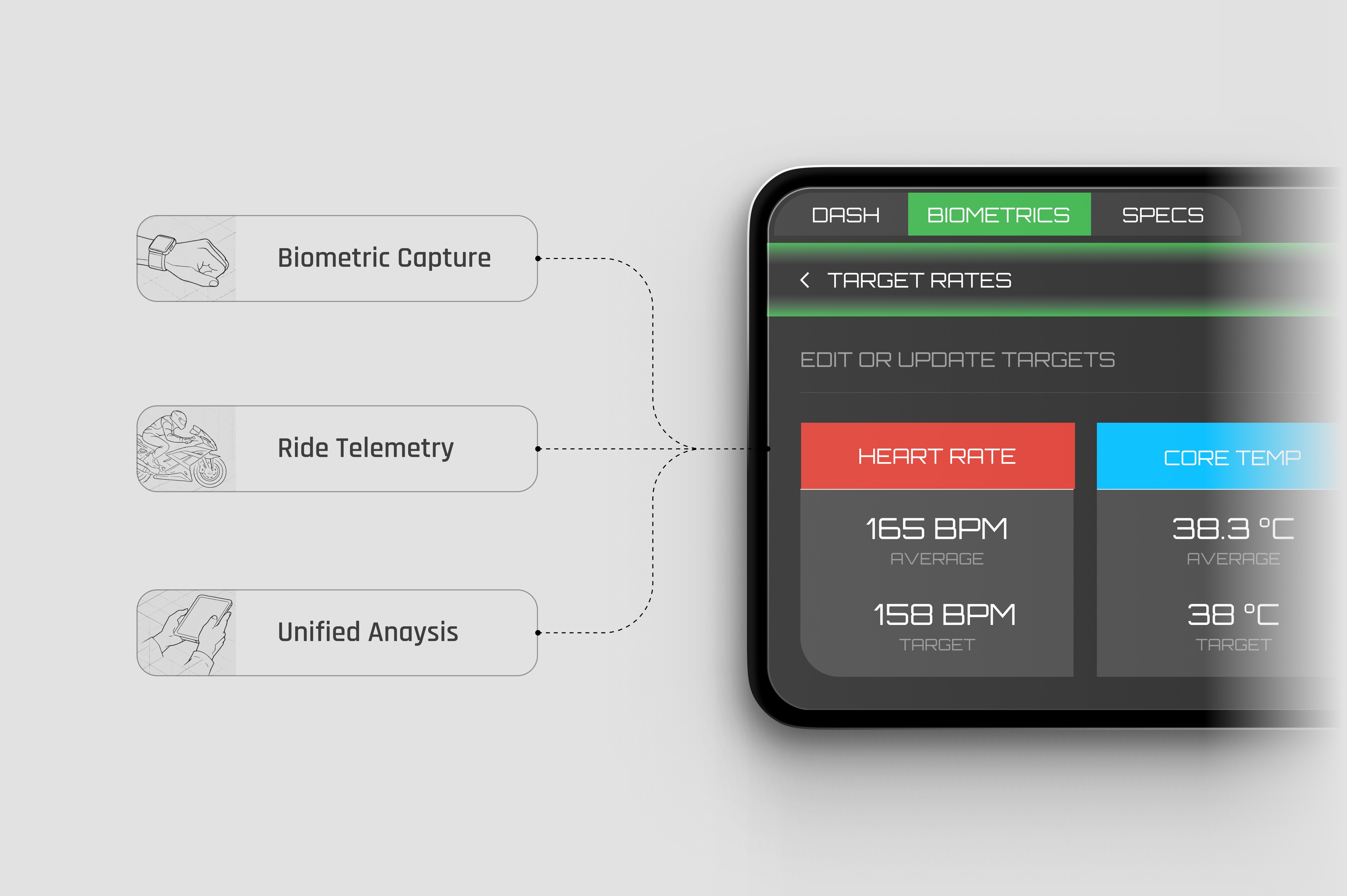 Apex connects wearable biometrics and on-bike telemetry into a unified performance system. Data is captured on and off the track, processed in real time, and translated into clear performance and recovery insights.