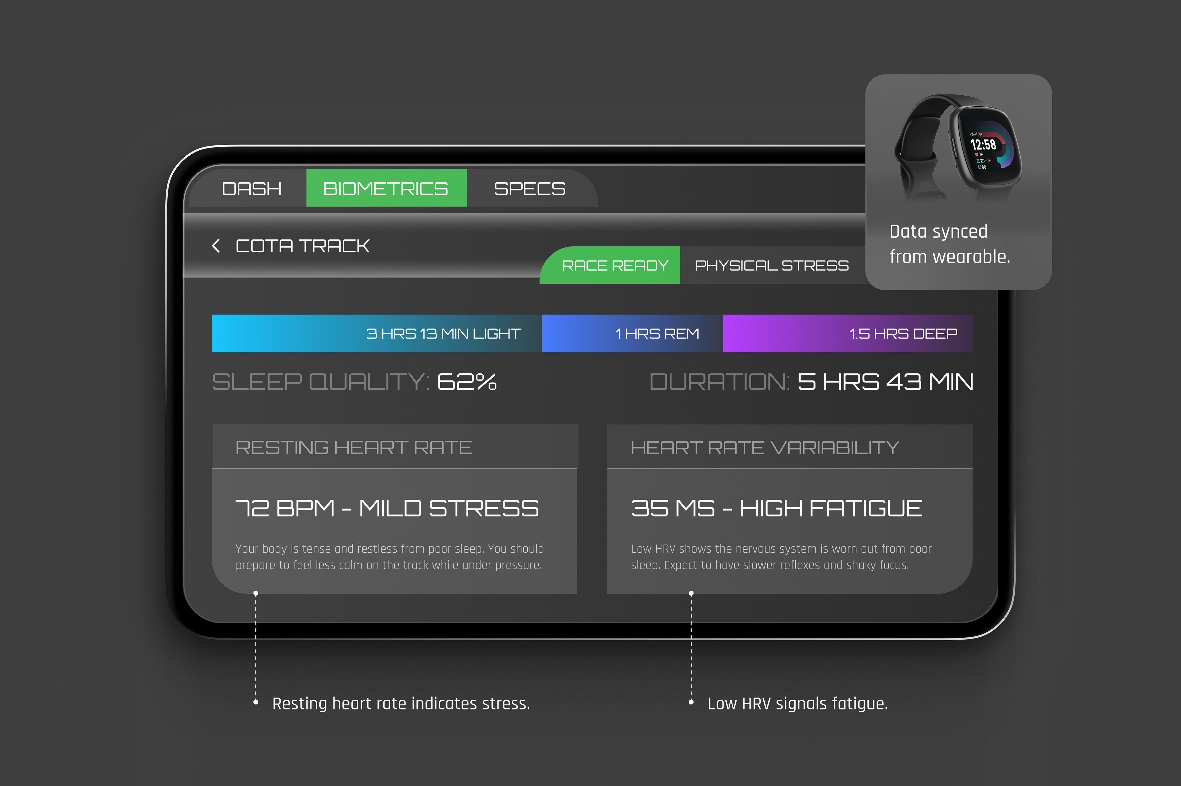 Race readiness evaluates baseline condition before entering the track. Sleep quality and duration establish recovery levels, while resting heart rate and heart rate variability indicate fatigue and physiological strain. Together, these signals determine performance capacity prior to the session.