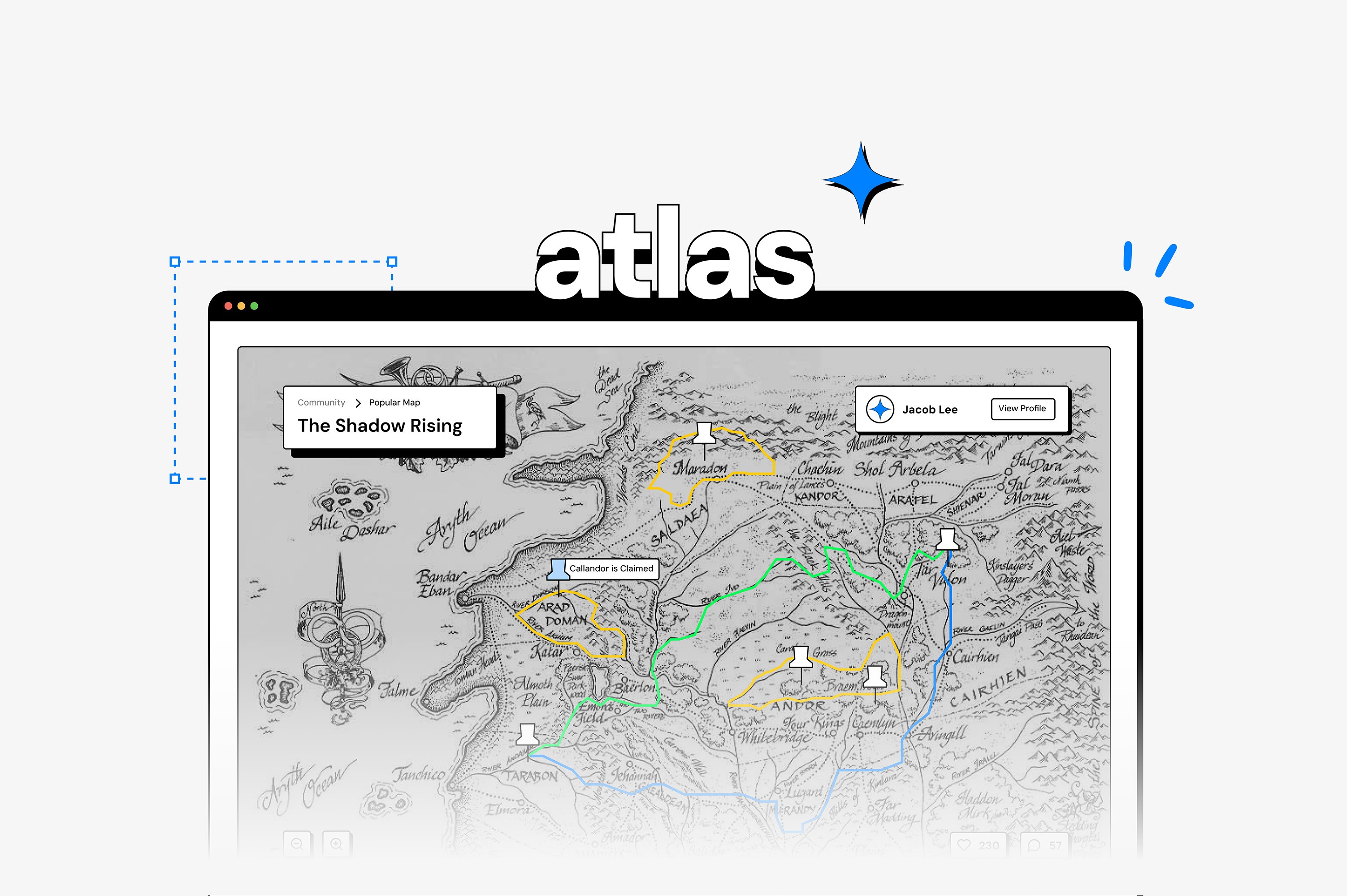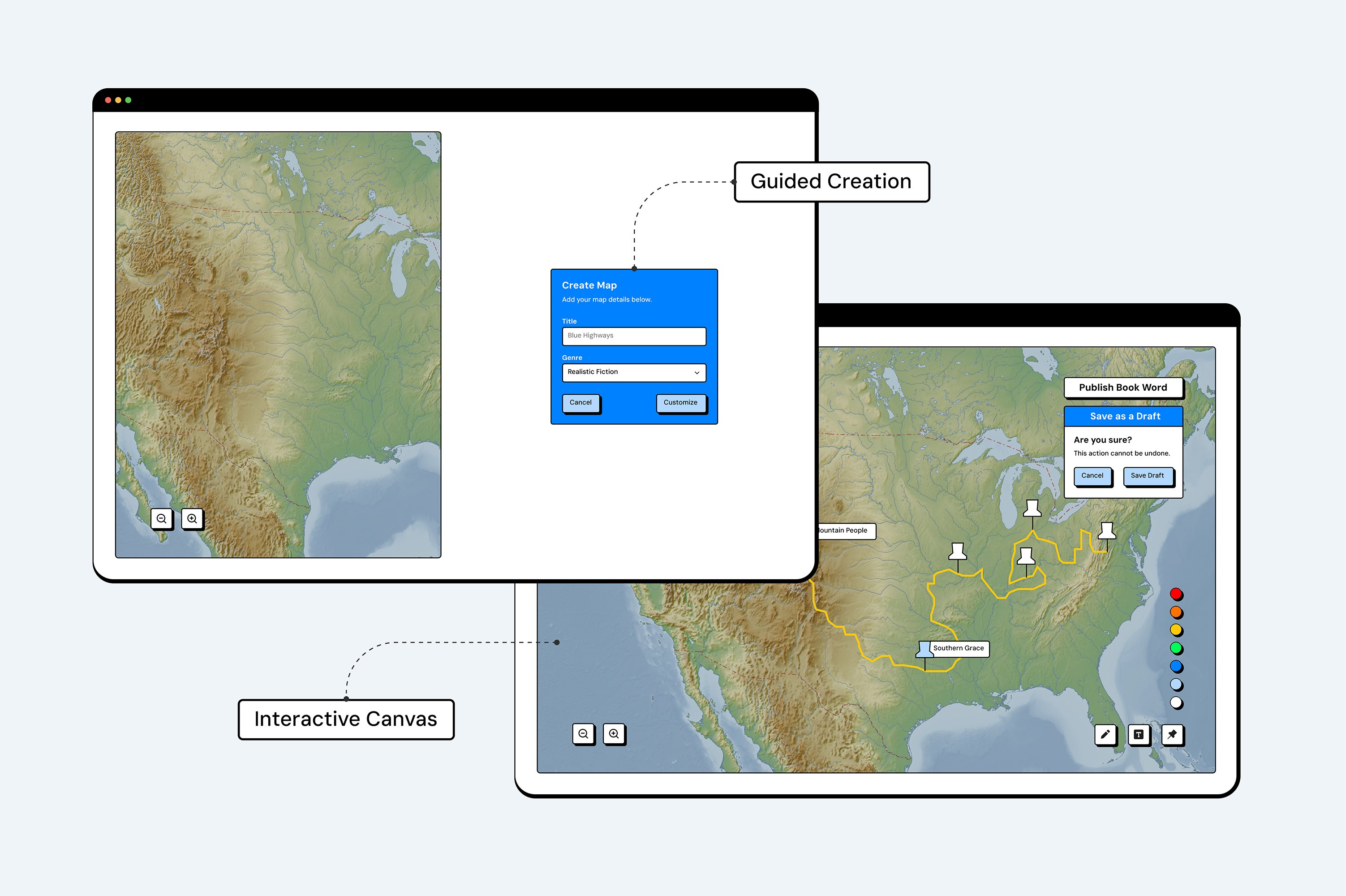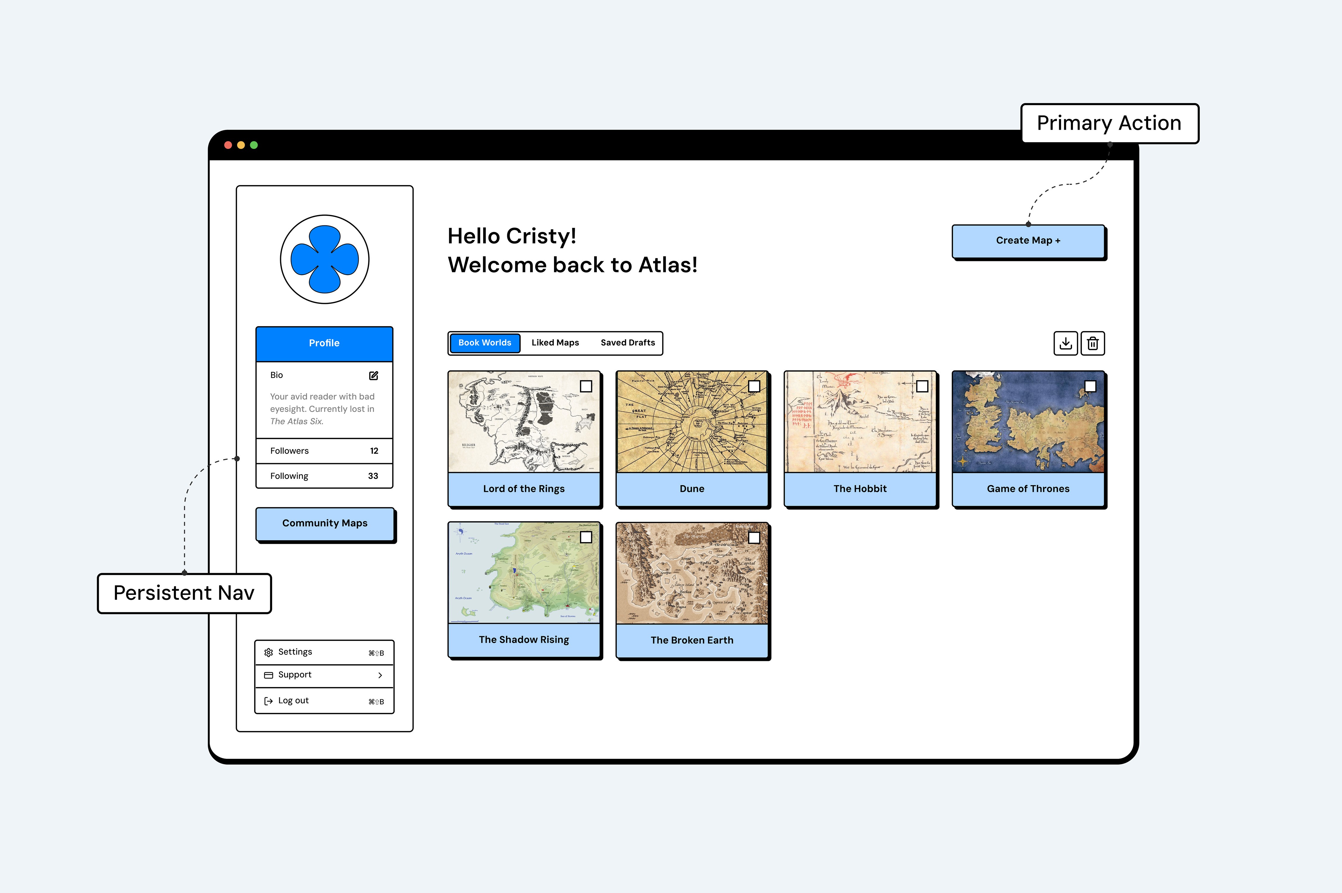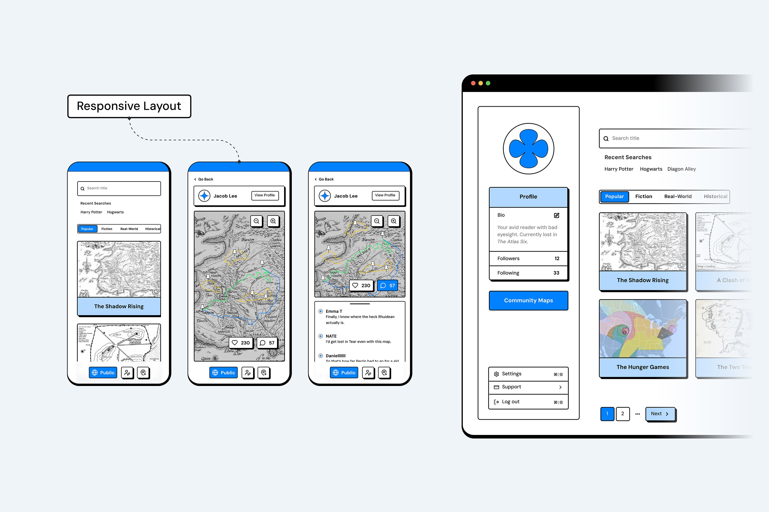 Atlas supports both creators building detailed book maps and explorers browsing community content. Features were defined through user stories centered on creating, customizing, sharing, and discovering maps, which directly informed the wireframes and overall structure of the platform.